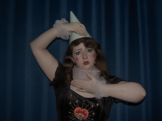 The Fool is all about performing and hiding parts of yourself for the audience- you put on the mask and show them what they want to see so that they like you. I dressed myself in a dunce cap that doubles as a clown hat to represent the constant feeling of idiocy that follows me around: nothing I seem to do is correct, I don't understand things the way others do, maybe I'm an actual fool and the village idiot. The makeup was inspired by classic harlequin designs and the tear on my cheek shows how sad the Fool is performing and how she knows this is the only way the audience will truly like her.